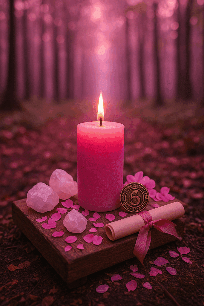 W rytuale różowy kolor pomaga kierować uwagę do obszaru serca – nie po to, by „leczyć rany”, lecz by zauważyć je z czułością i dać sobie prawo do delikatności. Wspiera zdolność do przyjmowania wsparcia, najpierw od siebie, a z czasem także od innych.